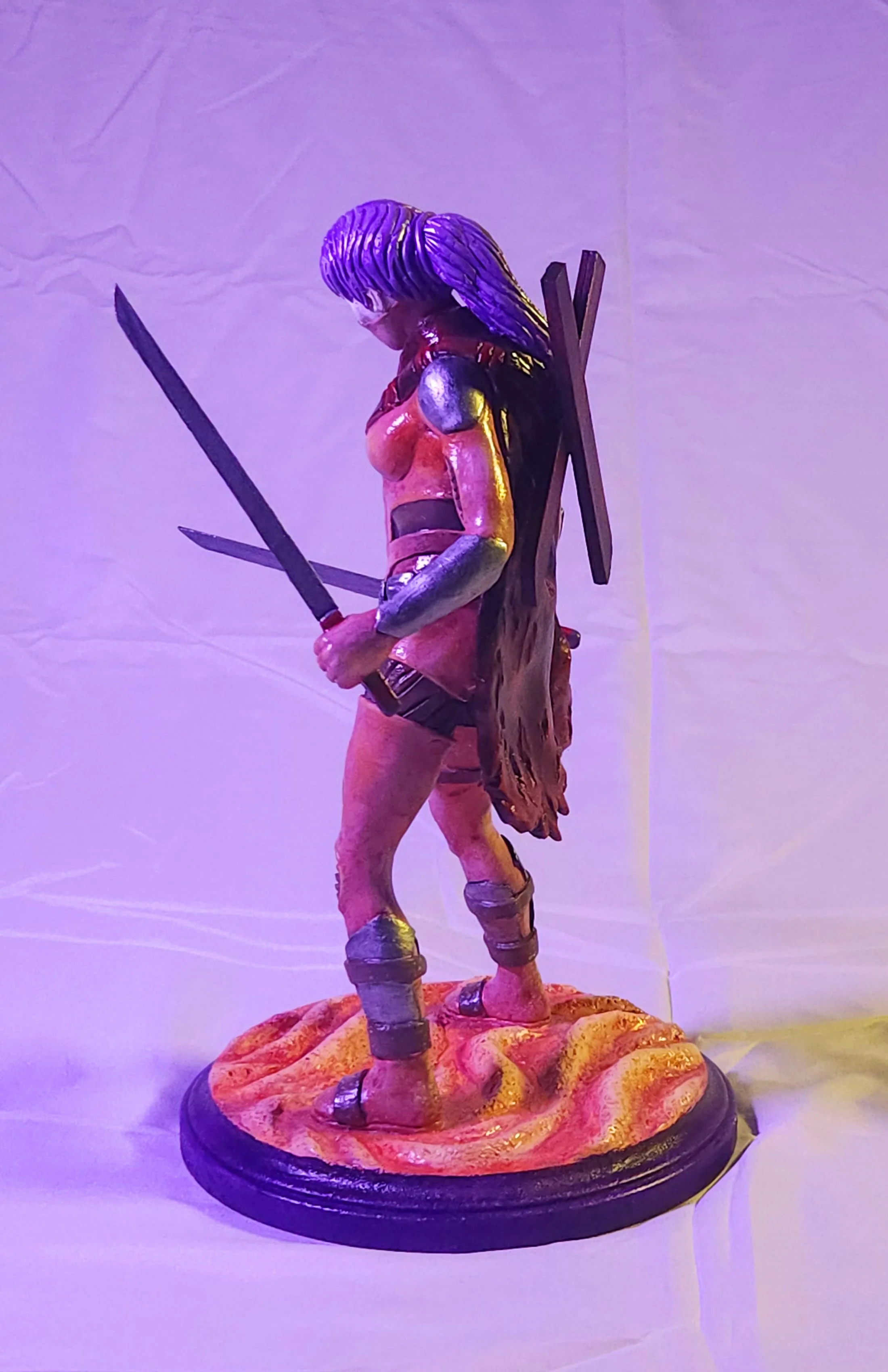 Alina is a bounty hunter character in my comic “Retribution”, and an ally to the main character Ren. This statue was hand sculpted using polymer clay, armature wire, tin foil and a wooden plaque base. Hand painted using acrylic paints. (11’’ tall)
